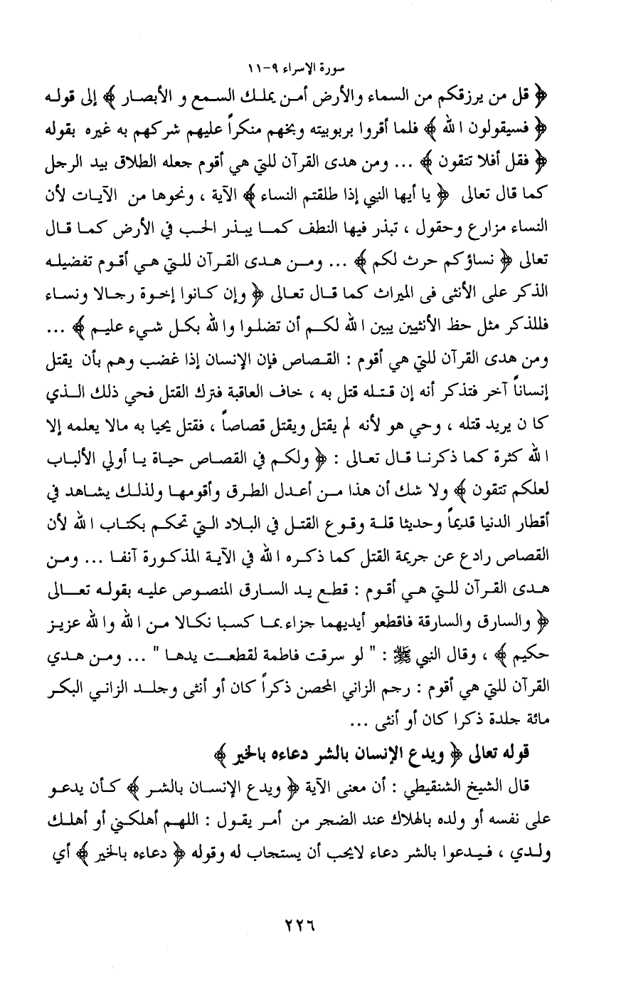 ومن هدى القرآن للتي هي أقوم: القصاص فإن الإنسان إذا غضب وهم بأن يقتل إنساناً آخر فتذكر أنه إن قتله قتل به، خاف العاقبة فترك القتل فحي ذلك الذي كان يريد قتله، وحي هو لأنه لم يقتل ويقتل قصاصا، فقتل يحيا به مالا يعلمه إلا الله كثرة كما ذكرنا قال تعالى: (ولكم في القصاص حياة يا أولي الألباب لعلكم تتقون) ولا شك أن هذا من أعدل الطرق وأقومها ولذلك يشاهد في أقطار الدنيا قديما وحديثا قلة وقوع القتل في البلاد التي تحكم بكتاب الله لأن القصاص رادع عن جريمة القتل كما ذكره الله في الآية المذكورة آنفا ... ومن هدى القرآن للتي هي أقوم: قطع يد السارق المنصوص عليه بقوله تعالى (والسارق والسارقة فاقطعو أيديهما جزاء بما كسبا نكالا من الله والله عزيز حكيم) ، وقال النبي - صَلَّى اللَّهُ عَلَيْهِ وَسَلَّمَ -: "لو سرقت فاطمة لقطعت يدها" ... ومن هدي القرآن للتي هي أقوم: رجم الزاني المحصن ذكرا كان أو أنثى وجلد الزاني البكر مائة جلدة ذكرا كان أو أنثى ...