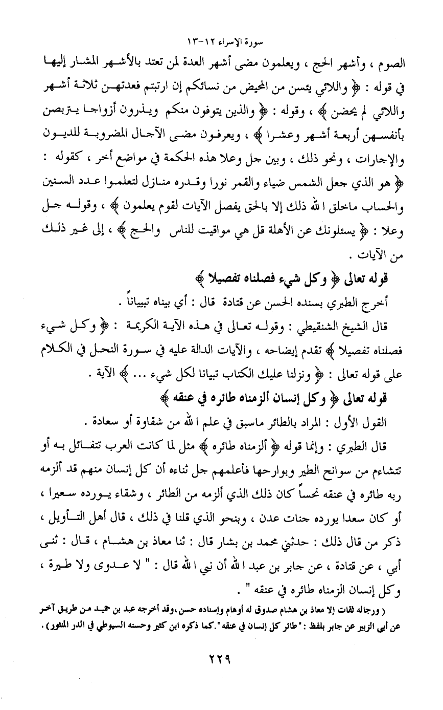 قال الطبري: وإنما قوله (ألزمناه طائره) مثل لما كانت العرب تتفائل به أو تتشاءم من سوانح الطير وبوارحها فأعلمهم جل ثناءه أن كل إنسان منهم قد ألزمه ربه طائره في عنقه نحسا كان ذلك الذي ألزمه من الطائر، وشقاء يورده سعيرا، أو كان سعدا يورده جنات عدن، وبنحو الذي قلنا في ذلك، قال أهل التأويل، ذكر من قال ذلك: حدثني محمد بن بشار قال: ثنا معاذ بن هشام، قال: ثنى أبي، عن قتادة، عن جابر بن عبد الله أن نبي الله قال: "لا عدوى ولا طيرة، وكل إنسان الزمناه طائره في عنقه".