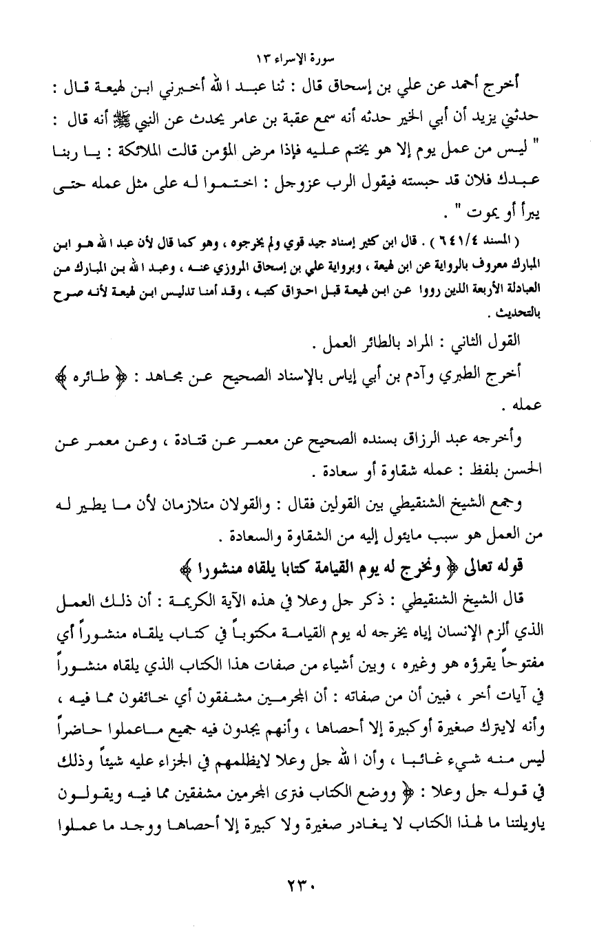 قال الشيخ الشنقيطي: ذكر جل وعلا في هذه الآية الكريمة: أن ذلك العمل الذي ألزم الإنسان إياه يخرجه له يوم القيامة مكتوبا في كتاب يلقاه منشورا أي مفتوحا يقرؤه هو وغيره، وبين أشياء من صفات هذا الكتاب الذي يلقاه منشورا في آيات أخر، فبين أن من صفاته: أن المجرمين مشفقون أي خائفون مما فيه، وأنه لايترك صغيرة أو كبيرة إلا أحصاها، وأنهم يجدون فيه جميع ماعملوا حاضرا ليس منه شيء غائبا، وأن الله جل وعلا لايظلمهم في الجزاء عليه شيئاً وذلك في قوله جل وعلا: (ووضع الكتاب فترى المجرمين مشفقين مما فيه ويقولون ياويلتنا ما لهذا الكتاب لا يغادر صغيرة ولا كبيرة إلا أحصاها ووجد ما عملوا