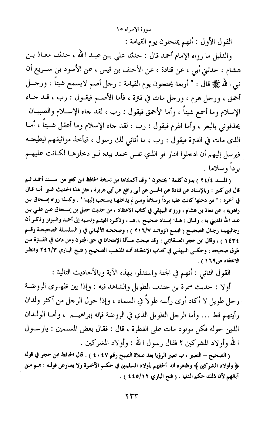 (المسند 4/24) بدون كلمة "يحتجون" وقد أكملناها من نسخة الحافظ ابن كثير من مسند أحمد ثم قال ابن كثير: وبالإسناد عن قتادة عن الحسن عن أبي رافع عن أبي هريرة، مثل هذا الحديث غير أنه قال في آخره: "من دخلها كانت عليه بردا وسلاما ومن لم يدخلها يسحب إليها". وكذا رواه إسحاق بن راهوية، عن معاذ بن هشام، ورواه البيهقي في كتاب الاعتقاد، من حديث حنبل بن إسحاق عن علي بن عبد الله المدينى به، وقال: هذا إسناد صحيح. ا. هـ، وذكره الهيثم ونسبه إلى أحمد والبزار وذكر أن رجاليهما رجال الصحيح (مجمع الزوائد 7/216) ، وصححه الألباني في (السلسلة الصحيحة رقم 1434) ، وقال ابن حجر العسقلاني: وقد صحت مسألة الإمتحان في حق المجنون ومن مات في الفترة من طرق صحيحه، وحكى البيهقي في كتاب الإعتقاد أنه المذهب الصحيح (فتح الباري 3/246 وانظر الاعتقاد ص 169) .