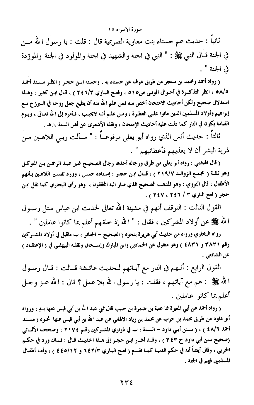 (رواه أحمد عن أبي المغيرة ثنا عتبة بن ضمرة بن حبيب قال ثني عبد الله بن أبي قيس عنها بهِ، ورواه أبو داود من طريق محمد بن حرب عن محمد بن زياد الالهاني عن عبد الله بن أبي قيس عنها نحوه (مسند أحمد 6/48) ، (سنن أبي داود- السنة، ب في ذراري المشركين رقم 2174، وصححه الألباني (صحيح سنن أبي داود ح 343) ، وقد أشار ابن حجر إلى هذا الحديث قال: فذاك ورد في حكم الحربي، وقال أيضاً أنه في حكم الدنيا كما تقدم (فتح الباري 3/642 و12/445) ، وأما أطفال المسلمين فهم في الجنة