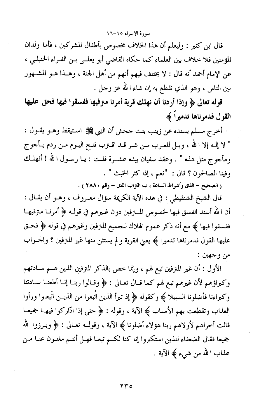قال الشيخ الشنقيطي: في هذه الآية الكريمة سؤال معروف، وهو أن يقال: أن الله أسند الفسق فيها لخصوص المترفين دون غيرهم في قوله (أمرنا مترفيها ففسقوا فيها) مع أنه ذكر عموم الهلاك للجميع المترفين وغيرهم في قوله (فحق عليها القول فدمرناها تدميرا) يعني القرية ولم يستثن منها غير المترفين؟ والجواب من وجهين: