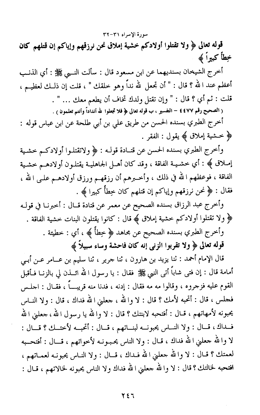 قوله تعالى (وَلَا تَقْتُلُوا أَوْلَادَكُمْ خَشْيَةَ إِمْلَاقٍ نَحْنُ نَرْزُقُهُمْ وَإِيَّاكُمْ إِنَّ قَتْلَهُمْ كَانَ خِطْئًا كَبِيرًا)