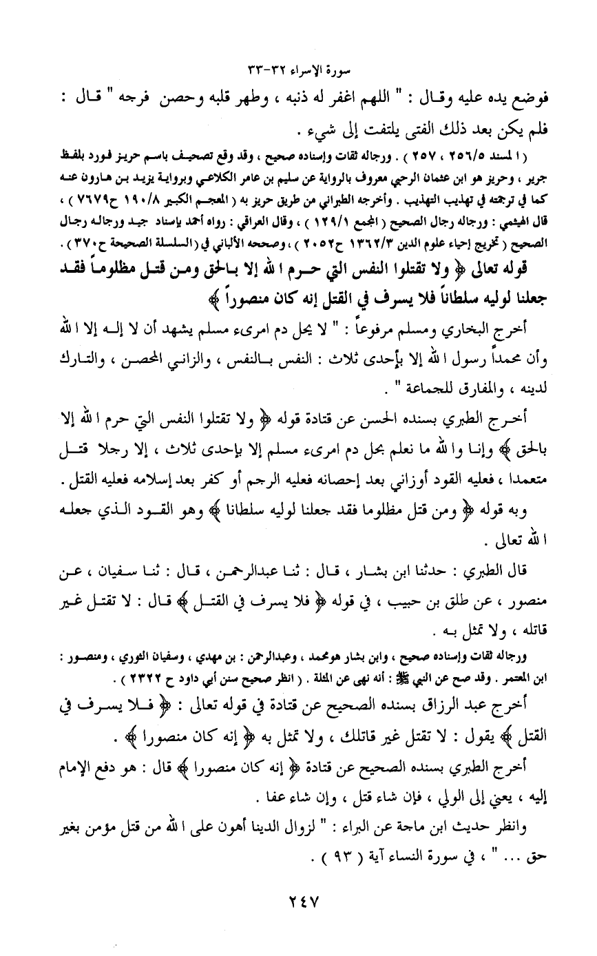 أخرج الطبري بسنده الحسن عن قتادة قوله (ولا تقتلوا النفس التي حرم الله إلا بالحق) وإنا والله ما نعلم بحل دم امرىء مسلم إلا بإحدى ثلاث، إلا رجلاً قتل متعمدا، فعليه القود أو زاني بعد إحصانه فعليه الرجم أو كفر بعد إسلامه فعليه القتل.