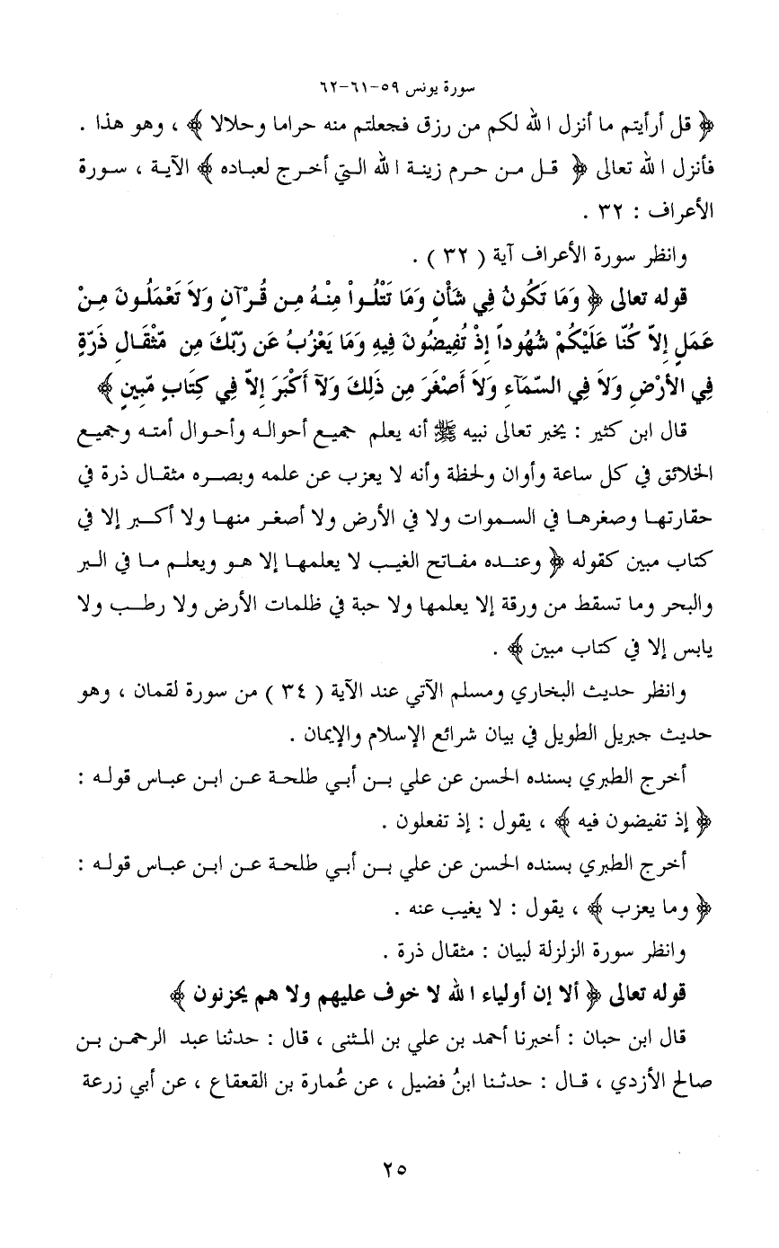 قوله تعالى (وَمَا تَكُونُ فِي شَأْنٍ وَمَا تَتْلُو مِنْهُ مِنْ قُرْآَنٍ وَلَا تَعْمَلُونَ مِنْ عَمَلٍ إِلَّا كُنَّا عَلَيْكُمْ شُهُودًا إِذْ تُفِيضُونَ فِيهِ وَمَا يَعْزُبُ عَنْ رَبِّكَ مِنْ مِثْقَالِ ذَرَّةٍ فِي الأرض وَلَا فِي السَّمَاءِ وَلَا أَصْغَرَ مِنْ ذَلِكَ وَلَا أَكْبَرَ إِلَّا فِي كِتَابٍ مُبِينٍ)