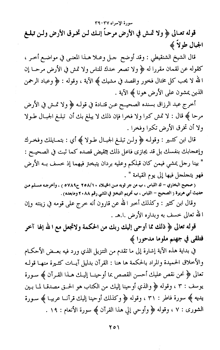 قال الشيخ الشنقيطي: وقد أوضح جل وعلا هذا المعنى في مواضع أخر، كقوله عن لقمان مقررا له (ولا تصعر خدك للناس ولا تمش في الأرض مرحا إن الله لا يحب كل مختال فخور واقصد في مشيك) الآية، وقوله: (وعباد الرحمن الذين يمشون على الأرض هونا) الآية.