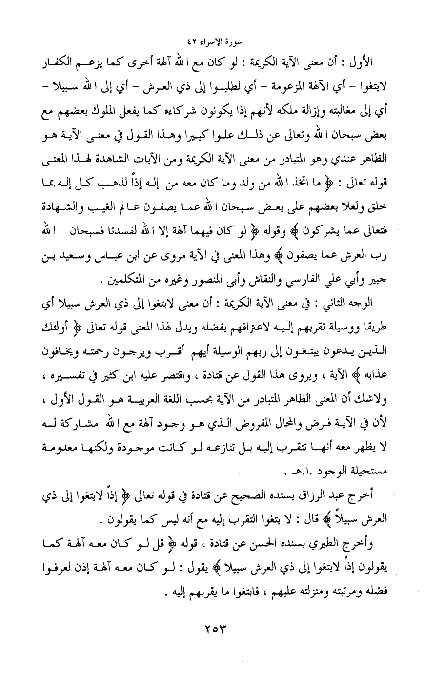 الوجه الثاني: في معنى الآية الكريمة: أن معنى لابتغوا إلى ذي العرش سبيلا أي طريقا ووسيلة تقربهم إليه لاعترافهم بفضله ويدل لهذا المعنى قوله تعالى (أولئك الذين يدعون يبتغون إلى ربهم الوسيلة أيهم أقرب ويرجون رحمته ويخافون عذابه) الآية، ويروى هذا القول عن قتادة، واقتصر عليه ابن كثير في تفسيره، ولاشك أن المعنى الظاهر المتبادر من الآية بحسب اللغة العربية هو القول الأول، لأن في الآية فرض والمحال المفروض الذي هو وجود آلهة مع الله مشاركة له لا يظهر معه أنها تتقرب إليه بل تنازعه لو كانت موجودة ولكنها معدومة مستحيلة الوجود. ا. هـ.