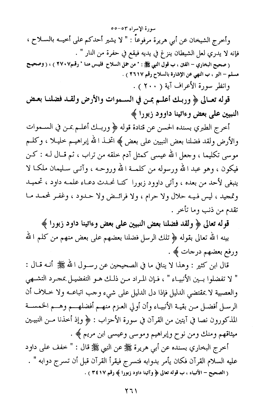 أخرج الطبري بسنده الحسن عن قتادة قوله (وربك أعلم بمن في السموات والأرض ولقد فضلنا بعض النبيين على بعض) اتخذ الله إبراهيم خليلا، وكلم موسى تكليما، وجعل الله عيسى كمثل آدم خلقه من تراب، ثم قال له: كن فيكون، وهو عبد الله ورسوله من كلمة الله وروحه، وآتى سليمان ملكا لا ينبغى لأحد من بعده، وآتى داوود زبورا كنا نحدث دعاء علمه داود، تحميد وتمجيد، ليس فيه حلال ولا حرام، ولا فرائض ولا حدود، وغفر لمحمد ما تقدم من ذنب وما تأخر.