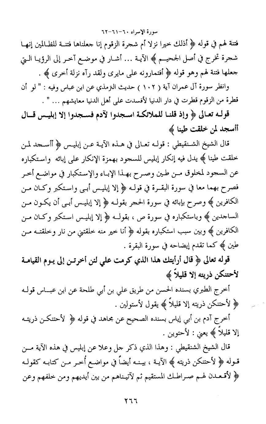 قال الشيخ الشنقيطي: قوله تعالى في هذه الآية عن إبليس (أأسجد لمن خلقت طينا) يدل فيه إنكار إبليس للسجود بهمزة الإنكار على إبائه واستكباره عن السجود لمخلوق من طين وصرح بهذا الإباء والاستكبار في مواضع أخر فصرح بهما معا في سورة البقرة في قوله (إلا إبليس أبي واستكبر وكان من الكافرين) وصرح بإبائه في سورة الحجر بقوله (إلا إبليس أبي أن يكون من الساجدين) وباستكباره في سورة ص، بقوله (إلا إبليس استكبر وكان من الكافرين) وبين سبب استكباره بقوله (أنا خير منه خلقتني من نار وخلقته من طين) كما تقدم إيضاحه في سورة البقرة.
