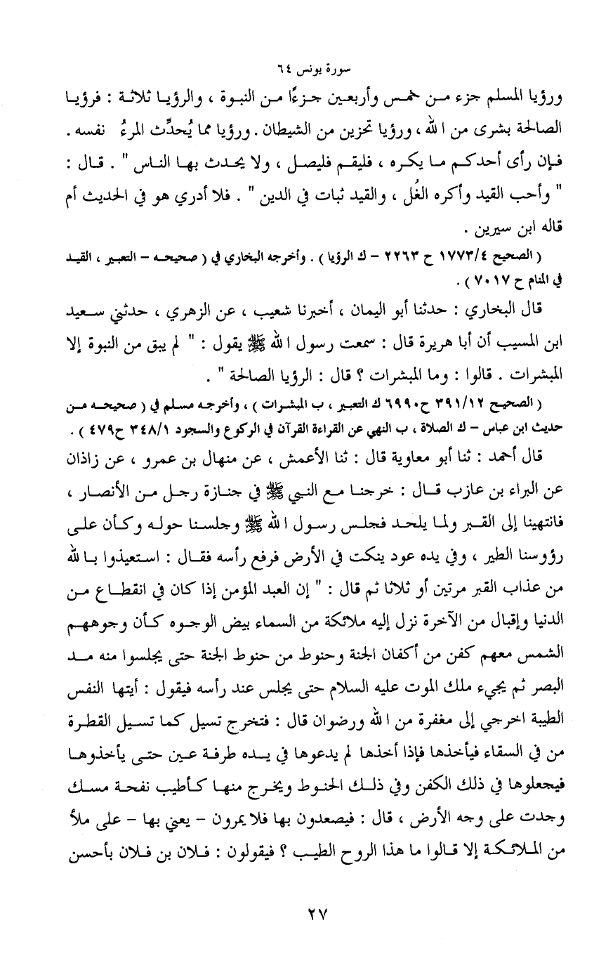 ورؤيا المسلم جزء من خمس وأربعين جزءا من النبوة، والرؤيا ثلاثة: فرؤيا الصالحة بشرى من الله، ورؤيا تحزين من الشيطان. ورؤيا مما يُحدث المرءُ نفسه.