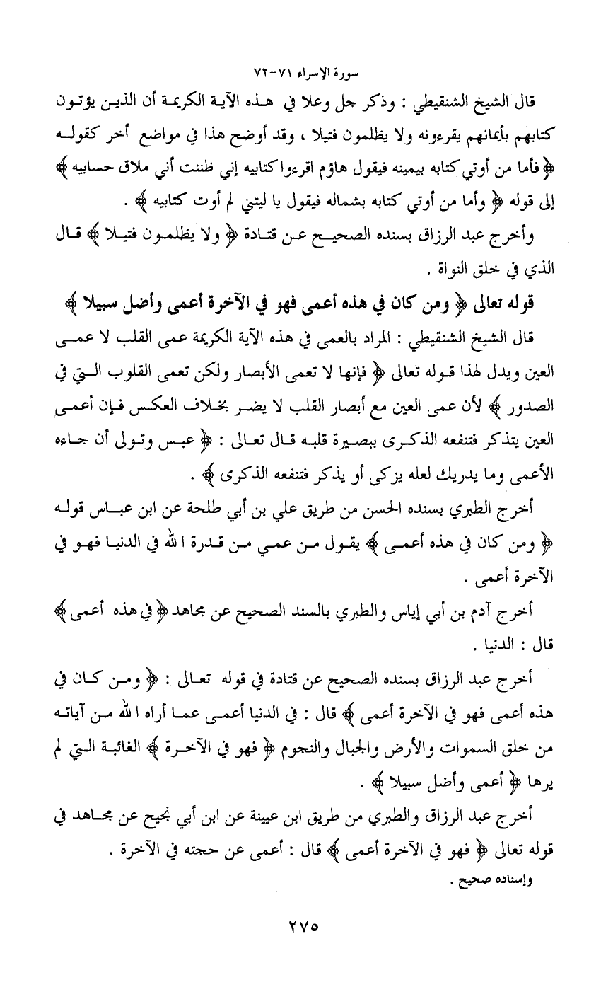 أخرج عبد الرزاق بسنده الصحيح عن قتادة في قوله تعالى: (ومن كان في هذه أعمى فهو في الآخرة أعمى) قال: في الدنيا أعمى عما أراه الله من آياته من خلق السموات والأرض والجبال والنجوم (فهو في الآخرة) الغائبة التي لم يرها (أعمى وأضل سبيلا) .