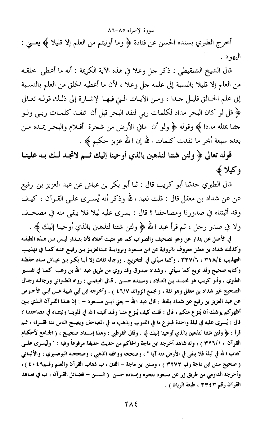 قال الطبري حدثنا أبو كريب قال: ثنا أبو بكر بن عياش عن عبد العزيز بن رفيع عن شداد بن معقل قال: قلت لعبد الله وذكر أنه يُسرى على القرآن، كيف وقد أثبتناه في صدورنا ومصاحفنا؟ قال: يسرى عليه ليلا فلا يبقى منه في مصحف ولا في صدر رجل، ثم قرأ عبد الله (ولئن شئنا لنذهبن بالذي أوحينا إليك) .