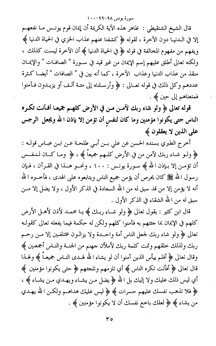 قوله تعالى (وَلَوْ شَاءَ رَبُّكَ لَآَمَنَ مَنْ فِي الْأَرْضِ كُلُّهُمْ جَمِيعًا أَفَأَنْتَ تُكْرِهُ النَّاسَ حَتَّى يَكُونُوا مُؤْمِنِينَ (99) وَمَا كَانَ لِنَفْسٍ أَنْ تُؤْمِنَ إِلَّا بِإِذْنِ اللَّهِ وَيَجْعَلُ الرِّجْسَ عَلَى الَّذِينَ لَا يَعْقِلُونَ)