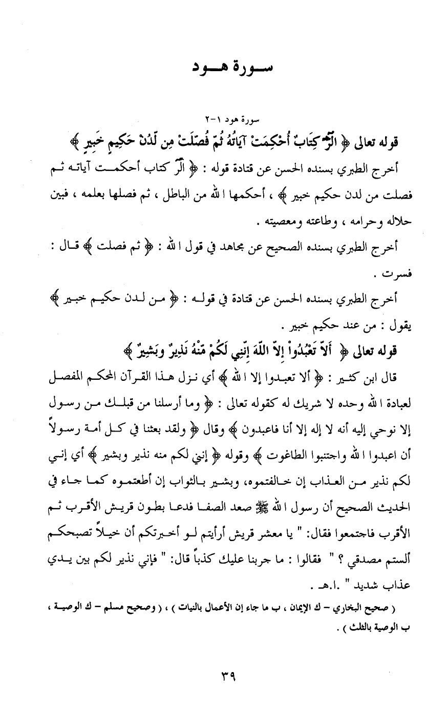 قال ابن كثير: (ألا تعبدوا إلا الله) أي نزل هذا القرآن المحكم المفصل لعبادة الله وحده لا شريك له كقوله تعالى: (وما أرسلنا من قبلك من رسول إلا نوحي إليه أنه لا إله إلا أنا فاعبدون) وقال (ولقد بعثنا في كل أمة رسولا أن اعبدوا الله واجتنبوا الطاغوت) وقوله (إنني لكم منه نذير وبشير) أي إني لكم نذير من العذاب إن خالفتموه، وبشر بالثواب إن أطعتموه كما جاء في الحديث الصحيح أن رسول الله - صَلَّى اللَّهُ عَلَيْهِ وَسَلَّمَ - صعد الصفا فدعا بطون قريش الأقرب ثم الأقرب فاجتمعوا فقال: "يا معشر قريش أرأيتم لو أخبرتكم أن خيلا تصبحكم ألستم مصدقي؟ " فقالوا: ما جربنا عليك كذبا قال: "فإني نذير لكم بين يدي عذاب شديد". ا. هـ.