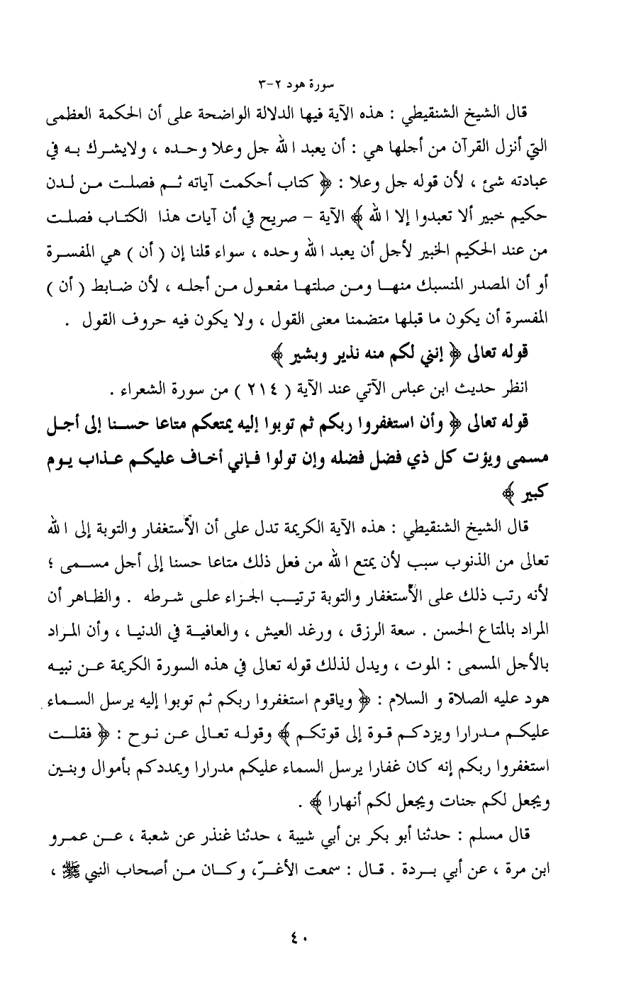 قال الشيخ الشنقيطي: هذه الآية فيها الدلالة الواضحة على أن الحكمة العظمى التي أنزل القرآن من أجلها هي: أن يعبد الله جل وعلا وحده، ولا يشرك به في عبادته شئ، لأن قوله جل وعلا: (كتاب أحكمت آياته ثم فصلت من لدن حكيم خبير ألا تعبدوا إلا الله) الآية- صريح في أن آيات هذا الكتاب فصلت من عند الحكيم الخبير لأجل أن يعبد الله وحده، سواء قلنا إن (أن) هي المفسرة أو أن المصدر المنسبك منها ومن صلتها مفعول من أجله، لأن ضابط (أن) المفسرة أن يكون ما قبلها متضمنا معنى القول، ولا يكون فيه حروف القول.