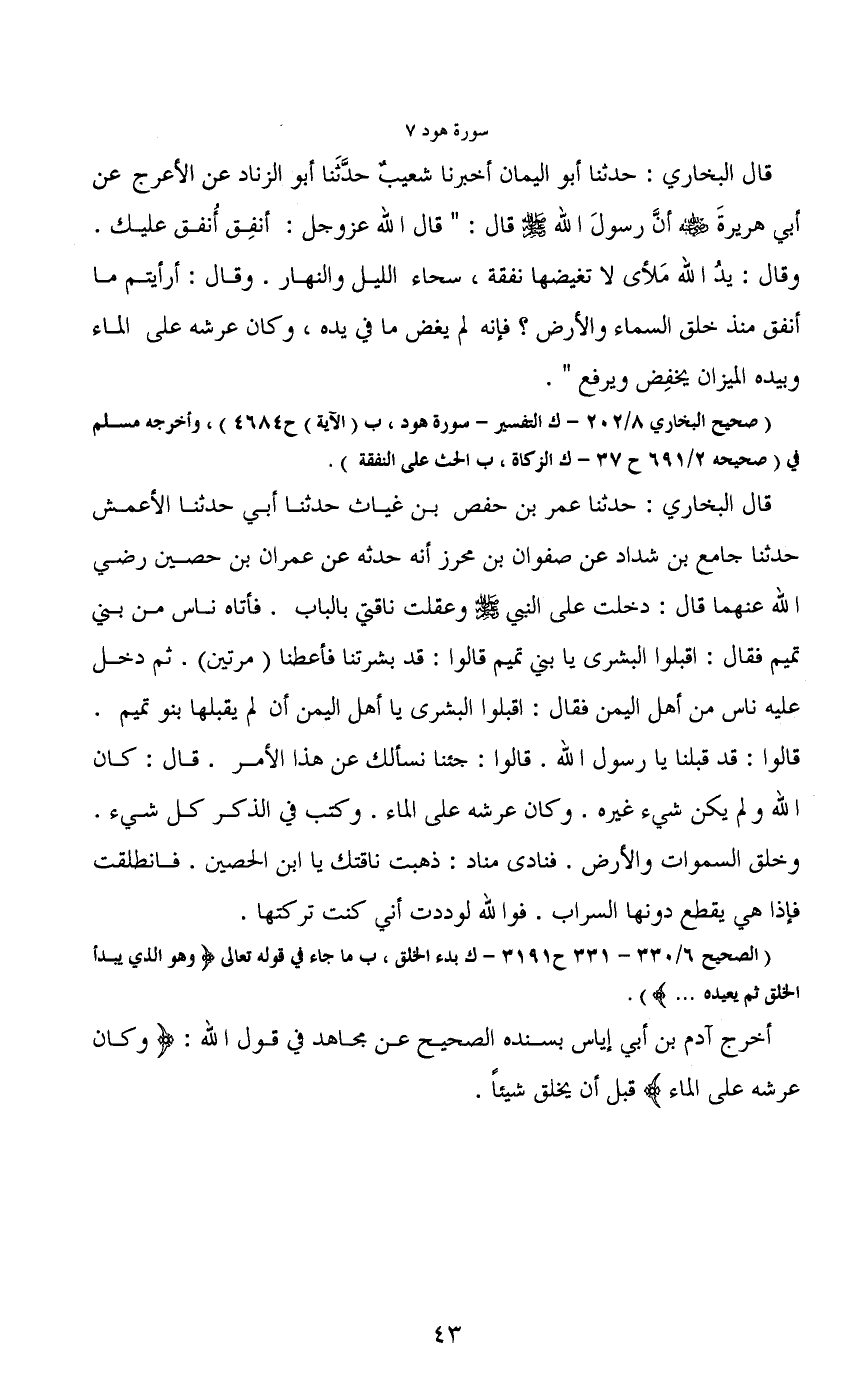 قال البخاري: حدثنا أبو اليمان أخبرنا شعيب حدَّثَنا أبو الزناد عن الأعرج عن أبي هريرة - رضي الله عنه - أنَّ رسول الله - صَلَّى اللَّهُ عَلَيْهِ وَسَلَّمَ - قال: "قال الله عز وجل: أنفِق أنفق عليك.