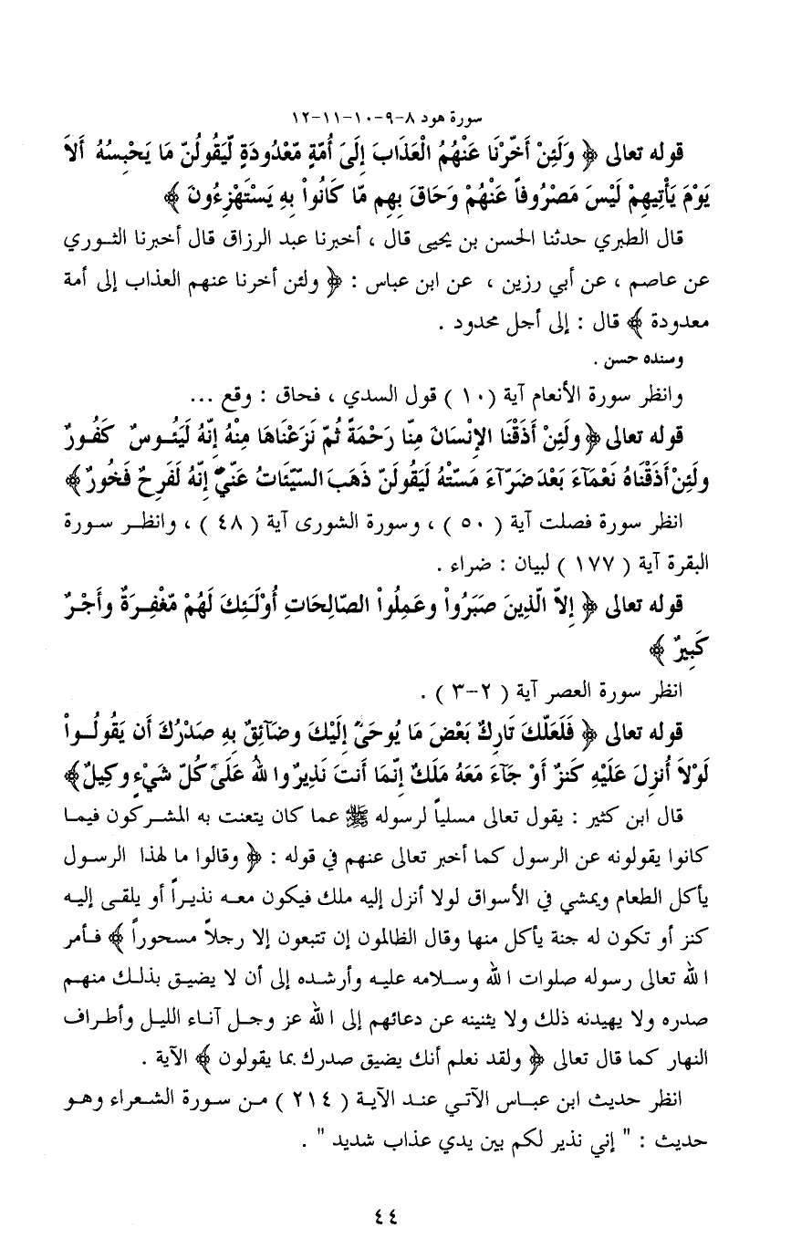 قال الطبري حدثنا الحسن بن يحيى قال، أخبرنا عبد الرزاق قال أخبرنا الثوري عن عاصم، عن أبي رزين، عن ابن عباس: (ولئن أخرنا عنهم العذاب إلى أمة معدودة) قال: إلى أجل محدود.