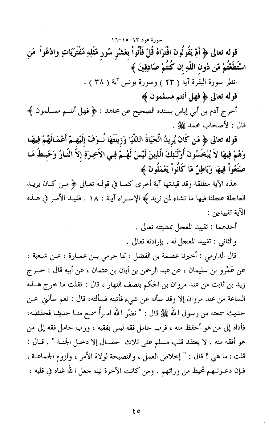 هذه الآية مطلقة وقد قيدتها آية أخرى كما في قوله تعالى (من كان يريد العاجلة عجلنا فيها ما نشاء لمن نريد) الإسراء آية: 18، فقيد الأمر في هذه الآية تقييدين:
