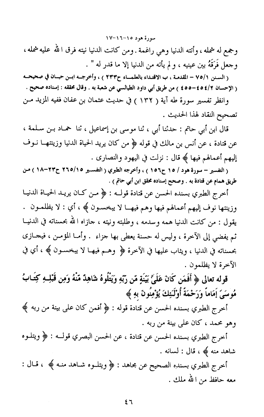 (التفسير- سورة هود/15 ح 156) ، وأخرجه الطبري (التفسير 15/265 ح 23-18) من طريق همام عن قتادة به. وصحح إسناده محقق ابن أبي حاتم) .
