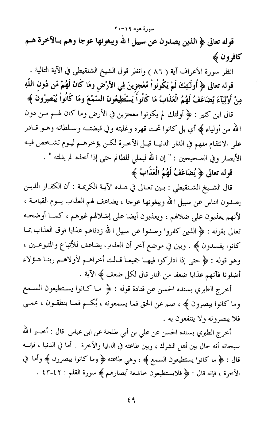 قال الشيخ الشنقيطي: بين تعالى في هذه الآية الكريمة: أن الكفار الذين يصدون الناس عن سبيل الله ويبغونها عوجا، يضاعف لهم العذاب يوم القيامة، لأنهم يعذبون على ضلالهم، ويعذبون أيضاً على إضلالهم غيرهم، كما أوضحه تعالى بقوله: (الذين كفروا وصدوا عن سبيل الله زدناهم عذاباً فوق العذاب بما كانوا يفسدون) . وبين في موضع آخر أن العذاب يضاعف للأتباع والمتبوعين، وهو قوله: (حتى إذا اداركوا فيها جميعاً قالت أخراهم لأولاهم ربنا هؤلاء أضلونا فآتهم عذاباً ضعفا من النار قال لكل ضعف) الآية.