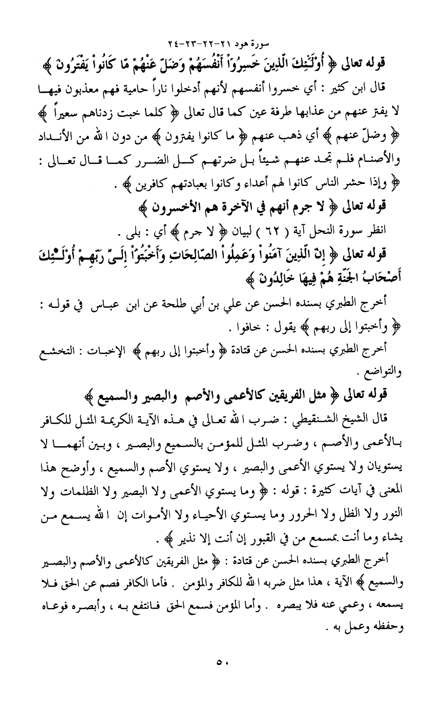 قال الشيخ الشنقيطي: ضرب الله تعالى في هذه الآية الكريمة المثل للكافر بالأعمى والأصم، وضرب المثل للمؤمن بالسميع والبصير، وبين أنهما لا يستويان ولا يستوي الأعمى والبصير، ولا يستوي الأصم والسميع، وأوضح هذا المعنى في آيات كثيرة: قوله: (وما يستوي الأعمي ولا البصير ولا الظلمات ولا النور ولا الظل ولا الحرور وما يستوي الأحياء ولا الأموات إن الله يسمع من يشاء وما أنت بمسمع من في القبور إن أنت إلا نذير) .