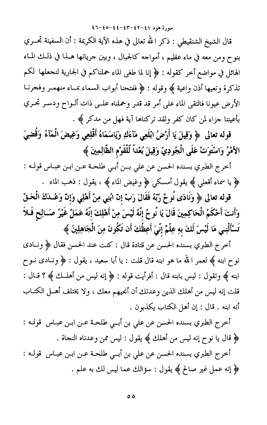 قوله تعالى (وَنَادَى نُوحٌ رَبَّهُ فَقَالَ رَبِّ إِنَّ ابْنِي مِنْ أَهْلِي وَإِنَّ وَعْدَكَ الْحَقُّ وَأَنْتَ أَحْكَمُ الْحَاكِمِينَ (45) قَالَ يَا نُوحُ إِنَّهُ لَيْسَ مِنْ أَهْلِكَ إِنَّهُ عَمَلٌ غَيْرُ صَالِحٍ فَلَا تَسْأَلْنِ مَا لَيْسَ لَكَ بِهِ عِلْمٌ إِنِّي أَعِظُكَ أَنْ تَكُونَ مِنَ الْجَاهِلِينَ)