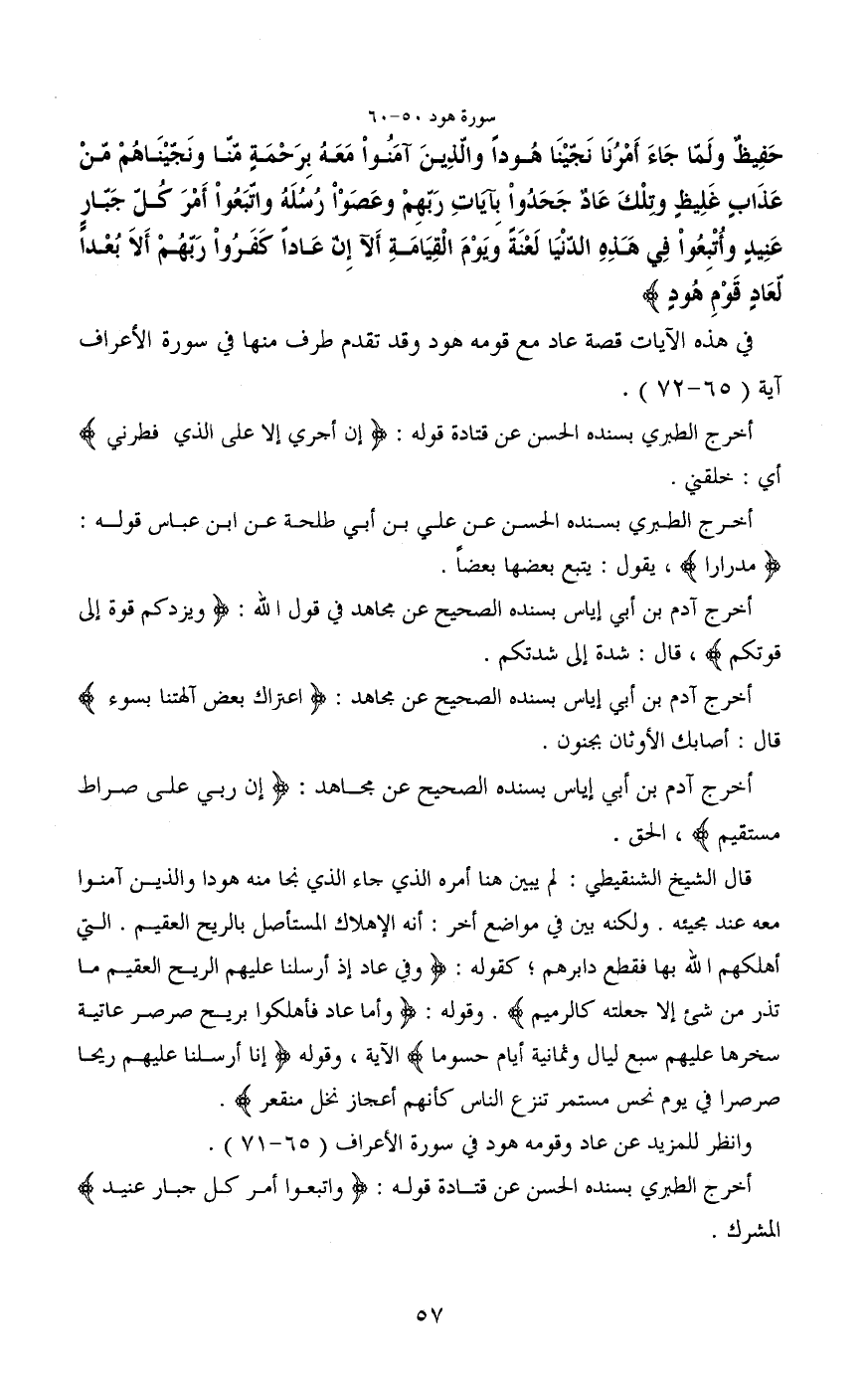 حَفِيظٌ (57) وَلَمَّا جَاءَ أَمْرُنَا نَجَّيْنَا هُودًا وَالَّذِينَ آمَنُوا مَعَهُ بِرَحْمَةٍ مِنَّا وَنَجَّيْنَاهُمْ مِنْ عَذَابٍ غَلِيظٍ (58) وَتِلْكَ عَادٌ جَحَدُوا بِآيَاتِ رَبِّهِمْ وَعَصَوْا رُسُلَهُ وَاتَّبَعُوا أَمْرَ كُلِّ جَبَّارٍ عَنِيدٍ (59) وَأُتْبِعُوا فِي هَذِهِ الدُّنْيَا لَعْنَةً وَيَوْمَ الْقِيَامَةِ أَلَا إِنَّ عَادًا كَفَرُوا رَبَّهُمْ أَلَا بُعْدًا لِعَادٍ قَوْمِ هُودٍ)
