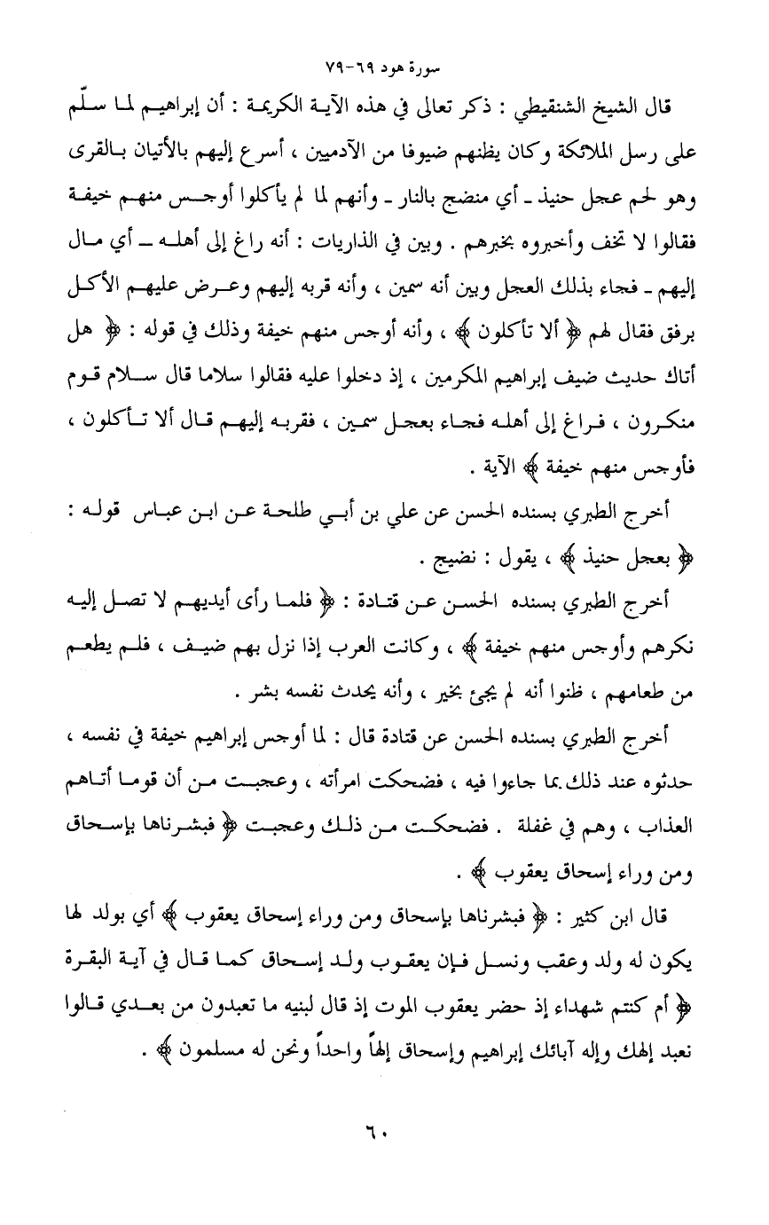 قال الشيخ الشنقيطي: ذكر تعالى في هذه الآية الكريمة: أن إبراهيم لما سلم على رسل الملائكة وكان يظنهم ضيوفا من الآدميين، أسرع إليهم بالأتيان بالقرى وهو لحم عجل حنيذ -أي منضج بالنار- وأنهم لما لم يأكلوا أوجس منهم خيفة فقالوا لا تخف وأخبروه بخبرهم. وبين في الذاريات: أنه راغ إلى أهله -أي مال إليهم- فجاء بذلك العجل وبين أنه سمين، وأنه قربه إليهم وعرض عليهم الأكل برفق فقال لهم (ألا تأكلون) ، وأنه أوجس منهم خيفة وذلك في قوله: (هل أتاك حديث ضيف إبراهيم المكرمين، إذ دخلوا عليه فقالوا سلاما قال سلام قوم منكرون، فراغ إلى أهله فجاء بعجل سمين، فقربه إليهم قال ألا تأكلون، فأوجس منهم خيفة) الآية.