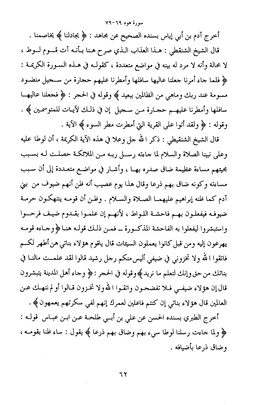 قال الشيخ الشنقيطي: ذكر الله جل وعلا في هذه الآية الكريمة، أن لوطا عليه وعلى نبينا الصلاة والسلام لما جاءته رسل ربه من الملائكة حصلت له بسبب مجيئهم مساءة عظيمة ضاق صدره بها، وأشار في مواضع متعددة إلى أن سبب مساءته وكونه ضاق بهم ذرعا وقال هذا يوم عصيب أنه ظن أنهم ضيوف من بني آدم كما ظنه إبراهيم عليهما الصلاة والسلام. وظن أن قومه ينتهكون حرمة ضيوفه فيفعلون بهم فاحشة اللواط، لأنهم إن علموا بقدوم ضيف فرحوا واستبشروا ليفعلوا به الفاحشة المذكورة - فمن ذلك قوله هنا (وجاءه قومه يهرعون إليه ومن قبل كانوا يعملون السيئات قال يا قوم هؤلاء بناتي هن أطهر لكم فاتقوا الله ولا تخزوني في ضيفي أليس منكم رجل رشيد قالوا لقد علمت مالنا في بناتك من حق وإنك لتعلم ما نريد) وقوله في الحجر: (وجاء أهل المدينة يتبشرون قال إن هؤلاء ضيفي فلا تفضحون واتقوا الله ولا تخزون قالوا أولم ننهك عن العالمين قال هؤلاء بناتي إن كنتم فاعلين لعمرك إنهم لفي سكرتهم يعمهون) .