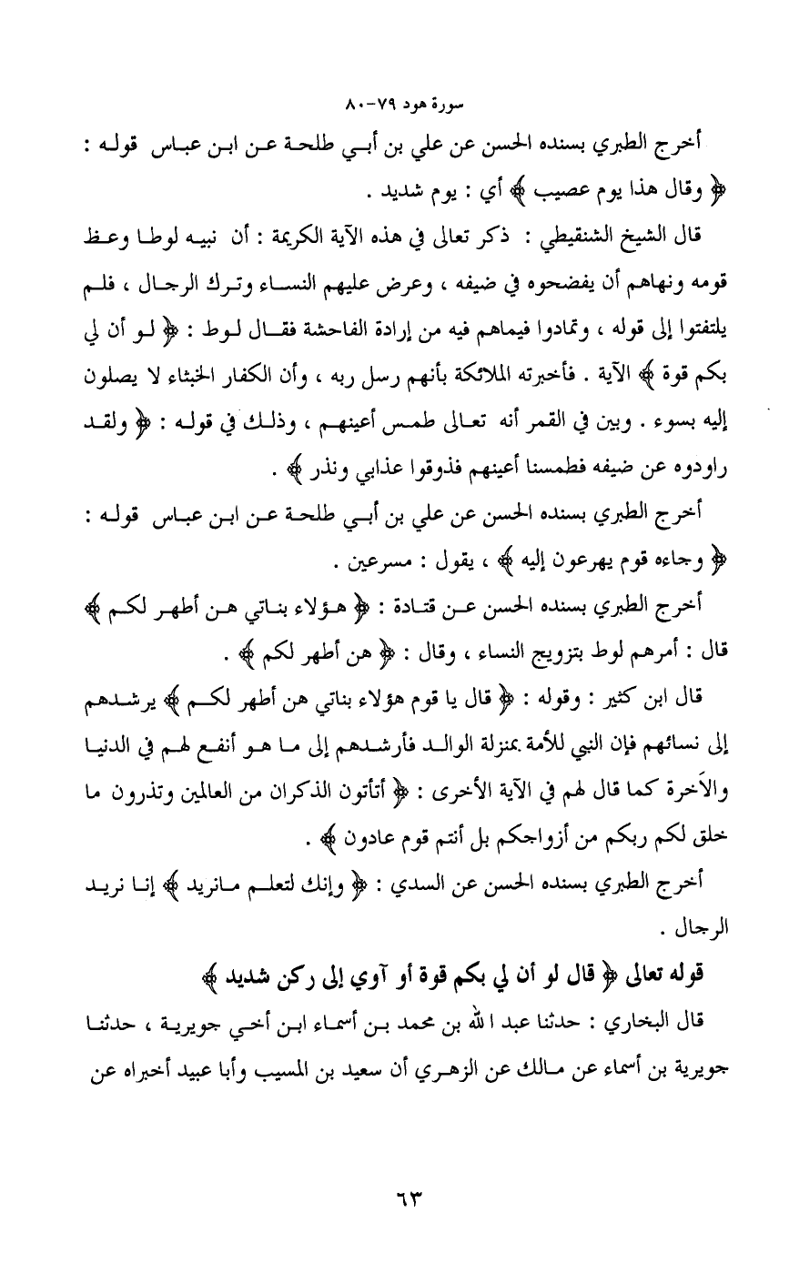 قال الشيخ الشنقيطي: ذكر تعالى في هذه الآية الكريمة: أن نبيه لوطا وعظ قومه ونهاهم أن يفضحوه في ضيفه، وعرض عليهم النساء وترك الرجال، فلم يلتفتوا إلى قوله، وتمادوا فيما هم فيه من إرادة الفاحشة فقال لوط: (لو أن لي بكم قوة) الآية. فأخبرته الملائكة بأنهم رسل ربه، وأن الكفار الخبثاء لا يصلون إليه بسوء. وبين في القمر أنه تعالى طمس أعينهم، وذلك في قوله: (ولقد راودوه عن ضيفه فطمسنا أعينهم فذوقوا عذابي ونذر) .