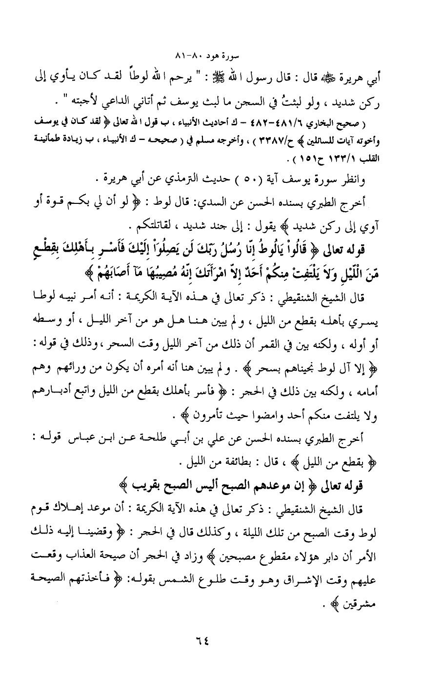قال الشيخ الشنقيطي: ذكر تعالى في هذه الآية الكريمة: أنه أمر نبيه لوطا يسري بأهله بقطع من الليل، ولم يبين هنا هل هو من آخر الليل، أو وسطه أو أوله، ولكنه بين في القمر أن ذلك من آخر الليل وقت السحر، وذلك في قوله: (إلا آل لوط نجيناهم بسحر) . ولم يبين هنا أنه أمره أن يكون من ورائهم وهم أمامه، ولكنه بين ذلك في الحجر: (فأسر بأهلك بقطع من الليل واتبع أدبارهم ولا يلتفت منكم أحد وامضوا حيث تأمرون) .