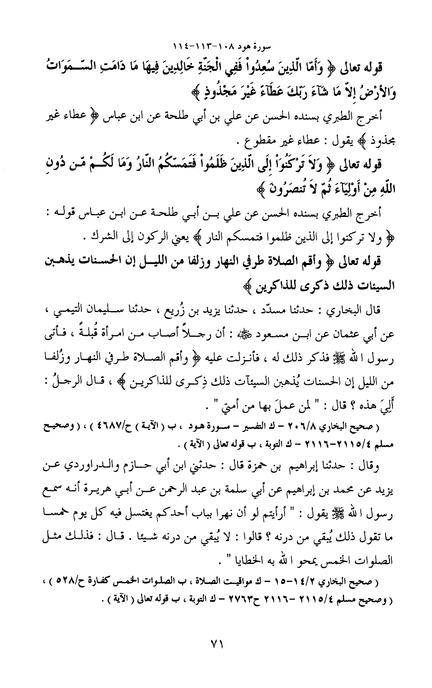 قال البخاري: حدثنا مسدّد، حدثنا يزيد بن زُريع، حدثنا سليمان التيمي، عن أبي عثمان عن ابن مسعود - رضي الله عنه -: أن رجلاً أصاب من امرأة قُبلة، فأتى رسول الله - صَلَّى اللَّهُ عَلَيْهِ وَسَلَّمَ - فذكر ذلك له، فأنزلت عليه (وأقم الصلاة طرفي النهار وزُلفا من الليل إن الحسنات يُذهبن السيئآت ذلك ذِكرى للذاكرين) ، قال الرجل: أَلِيَ هذه؟ قال: "لمن عملَ بها من أمتي".