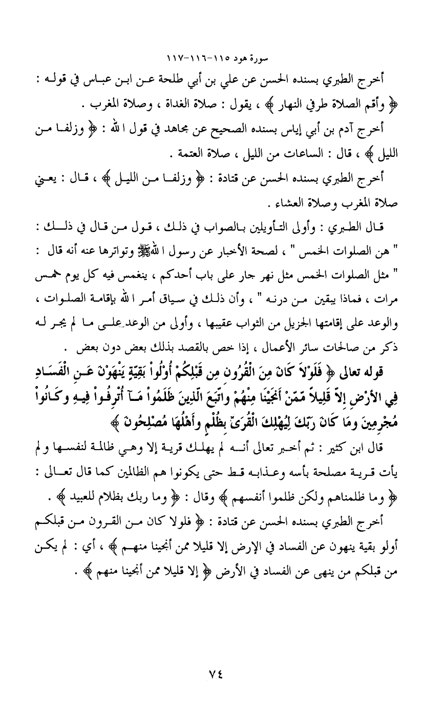 أخرج الطبري بسنده الحسن عن قتادة: (فلولا كان من القرون من قبلكم أولو بقية ينهون عن الفساد في الأرض إلا قليلاً ممن أنجينا منهم) ، أي: لم يكن من قبلكم من ينهى عن الفساد في الأرض (إلا قليلاً ممن أنجينا منهم) .