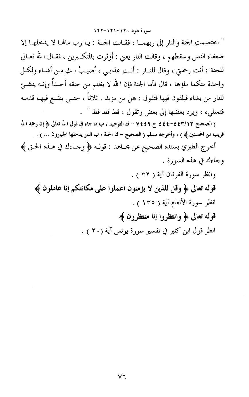 "اختصمتِ الجنة والنار إلى ربهما، فقالت الجنة: يا رب مالها لا يدخلها إلا ضعفاء الناس وسقطهم، وقالت النار يعني: أوثرت بالمتكبرين، فقال الله تعالى للجنة: أنت رحمتي، وقال للنار: أنتِ عذابي، أصيبُ بكِ من أشاء ولكل واحدة منكما ملؤها، قال فأما الجنة فإن الله لا يظلم من خلقه أحدا وإنه ينشئ للنار من يشاء فيلقون فيها فتقول: هل من مزيد. ثلاثا، حتى يضع فيها قدمه فتمتليء، ويرد بعضها إلى بعض وتقول: قط قط قط".