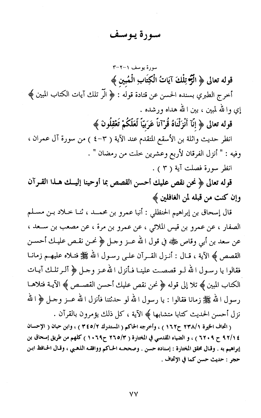 قال إسحاق بن إبراهيم الحنظلي: أنبا عمرو بن محمد، ثنا خلاد بن مسلم الصفار، عن عمرو بن قيس الملائي، عن عمرو بن مرة، عن مصعب بن سعد، عن سعد بن أبي وقاص - رضي الله عنه - في قول الله عز وجل (نحن نقص عليك أحسن القصص) الآية، قال: أنزل القرآن على رسول الله - صَلَّى اللَّهُ عَلَيْهِ وَسَلَّمَ - فتلاه عليهم زمانا فقالوا يا رسول الله لو قصصت علينا فأنزل الله عز وجل (الر تلك آيات الكتاب المبين) تلا إلى قوله (نحن نقص عليك أحسن القصص) الآية فتلاها رسول الله - صَلَّى اللَّهُ عَلَيْهِ وَسَلَّمَ - زمانا فقالوا: يا رسول الله لو حدثتنا فأنزل الله عز وجل (الله نزل أحسن الحديث كتابا متشابها) الآية، كل ذلك يؤمرون بالقرآن.