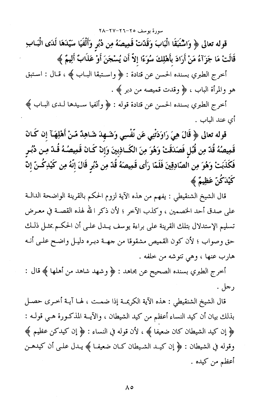 قال الشيخ الشنقيطي: يفهم من هذه الآية لزوم الحكم بالقرينة الواضحة الدالة على صدق أحد الخصمين، وكذب الآخر؛ لأن ذكر الله لهذه القصة في معرض تسليم الإستدلال بتلك القرينة على براءة يوسف يدل على أن الحكم بمثل ذلك حق وصواب، لأن كون القميص مشقوقا من جهة دبره دليل واضح على أنه هارب عنها، وهي تنوشه من خلفه.