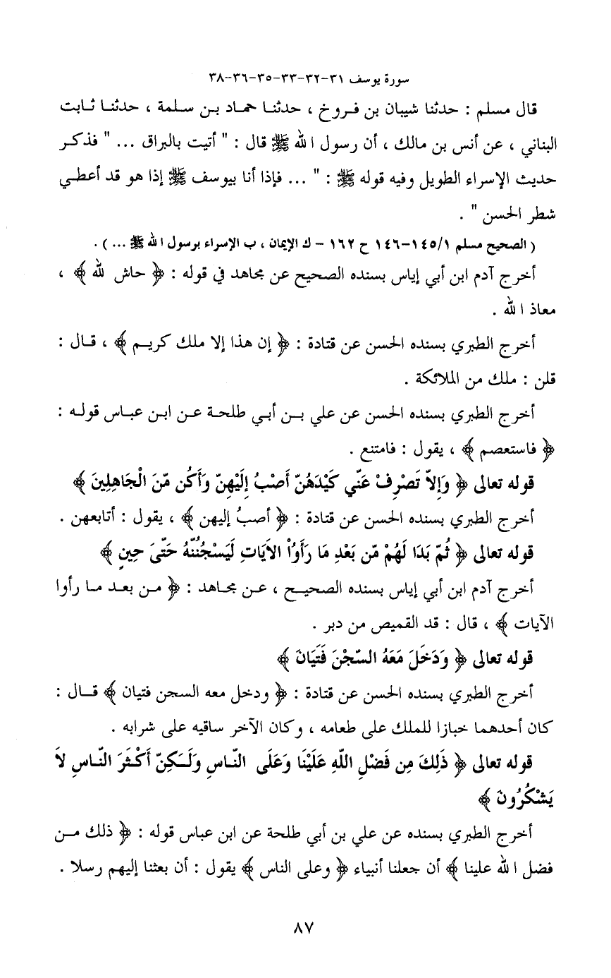 قال مسلم: حدثنا شيبان بن فروخ، حدثنا حماد بن سلمة، حدثنا ثابت البنانى، عن أنس بن مالك، أن رسول الله - صَلَّى اللَّهُ عَلَيْهِ وَسَلَّمَ - قال: "أتيت بالبراق ... " فذكر حديث الإسراء الطويل وفيه قوله - صَلَّى اللَّهُ عَلَيْهِ وَسَلَّمَ -: " ... فإذا أنا بيوسف - صَلَّى اللَّهُ عَلَيْهِ وَسَلَّمَ - إذا هو قد أعطي شطر الحسن".
