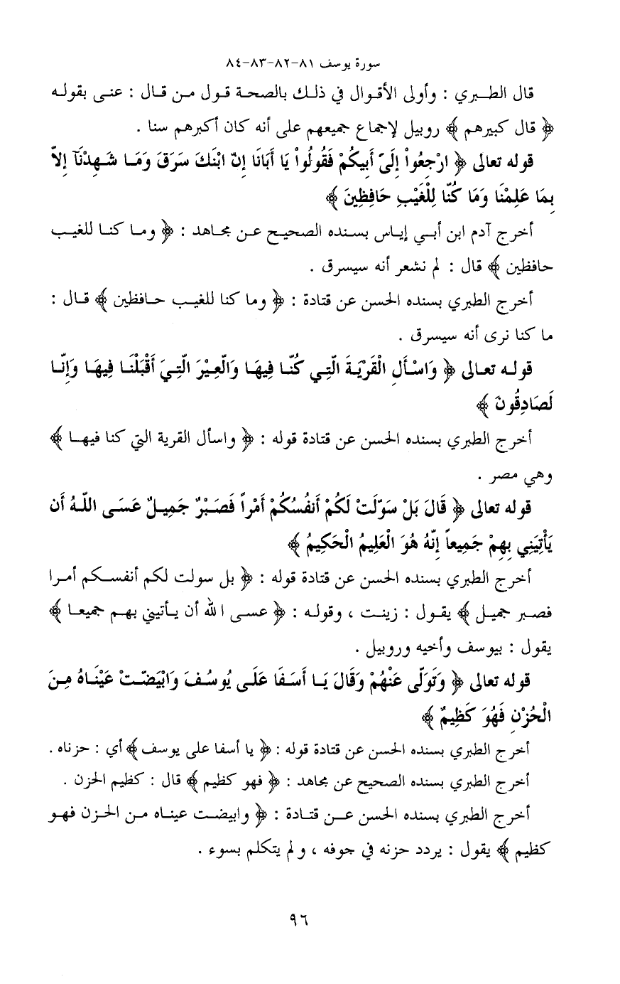 أخرج الطبري بسنده الحسن عن قتادة قوله: (بل سولت لكم أنفسكم أمرا فصبر جميل) يقول: زينت، وقوله: (عسى الله أن يأتيني بهم جميعاً) يقول: بيوسف وأخيه وروبيل.