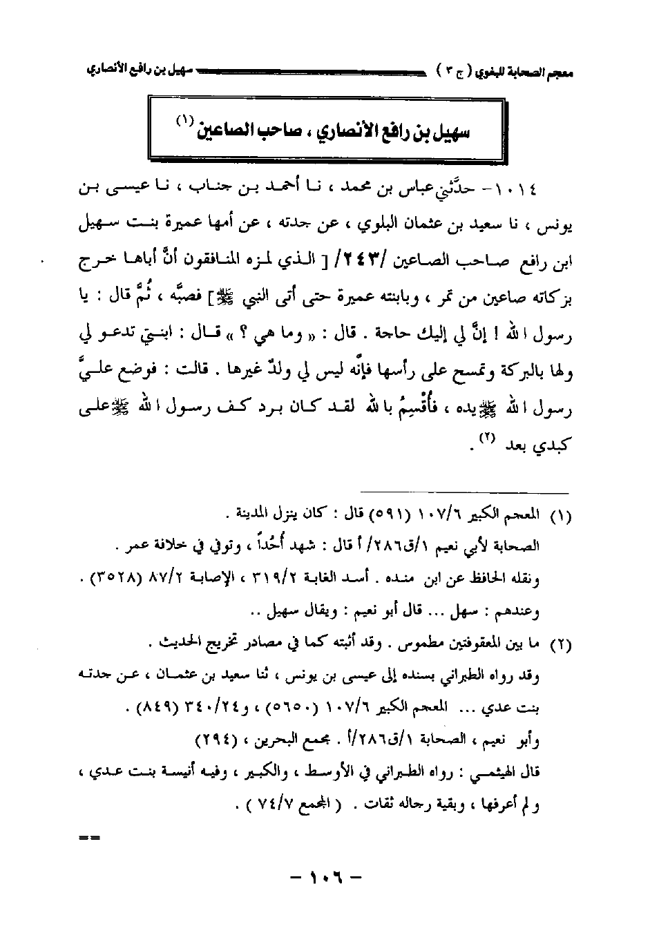 ١٠١٤ - حدثني عباس بن محمد نا أحمد بن جناب نا عيسى بن يونس نا سعيد بن عثمان البلوي عن جدته عن أمها عميرة بنت سهيل بن رافع صاحب الصاعين//٢٤٣// [الذي لمزه المنافقون أن أباها خرج بزكاته صاعين من تمر وبابنته عميرة حتى أتى النبي صلى الله عليه وسلم] فصبه ثم قال: يارسول الله! إن لي إليك حاجة. قال: " وما هي؟ " قال: ابنتي تدعو لي ولها بالبركة وتمسح على رأسها فإنه ليس لي ولد غيرها. قالت: فوضع علي رسول الله صلى الله عليه وسلم يده. فأقسم بالله لقد كان برد كف رسول الله صلى الله عليه وسلم على كبدي بعد.