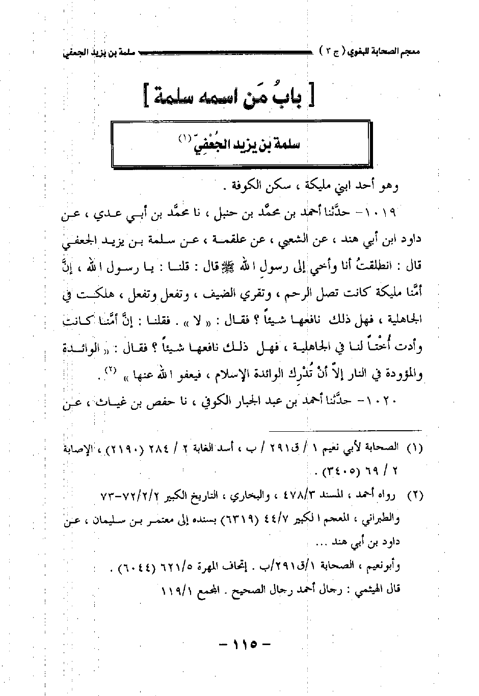 ١٠١٩ - حدثنا (*) أحمد بن محمد بن حنبل نا محمد بن أبي عدي عن داود بن أبي هند عن الشعبي عن علقمة عن سلمة بن يزيد الجعفي قال: انطلقت أنا وأخي إلى رسول الله صلى الله عليه وسلم قال: قلنا: يارسول الله إن أمنا مليكة كانت تصل الرحم وتقري الضيف وتفعل وتفعل هلكت في الجاهلية فهل ذلك (**) نافعها شيئا؟ فقال: " لا ". فقلنا: إن أمنا كانت وأدت أختا في الجاهلية فهل ذلك نافعها شيئا؟ فقال: " الوائدة والمؤودة في النار، إلا أن تدرك الوائدة الإسلام فيعفو الله عنها.