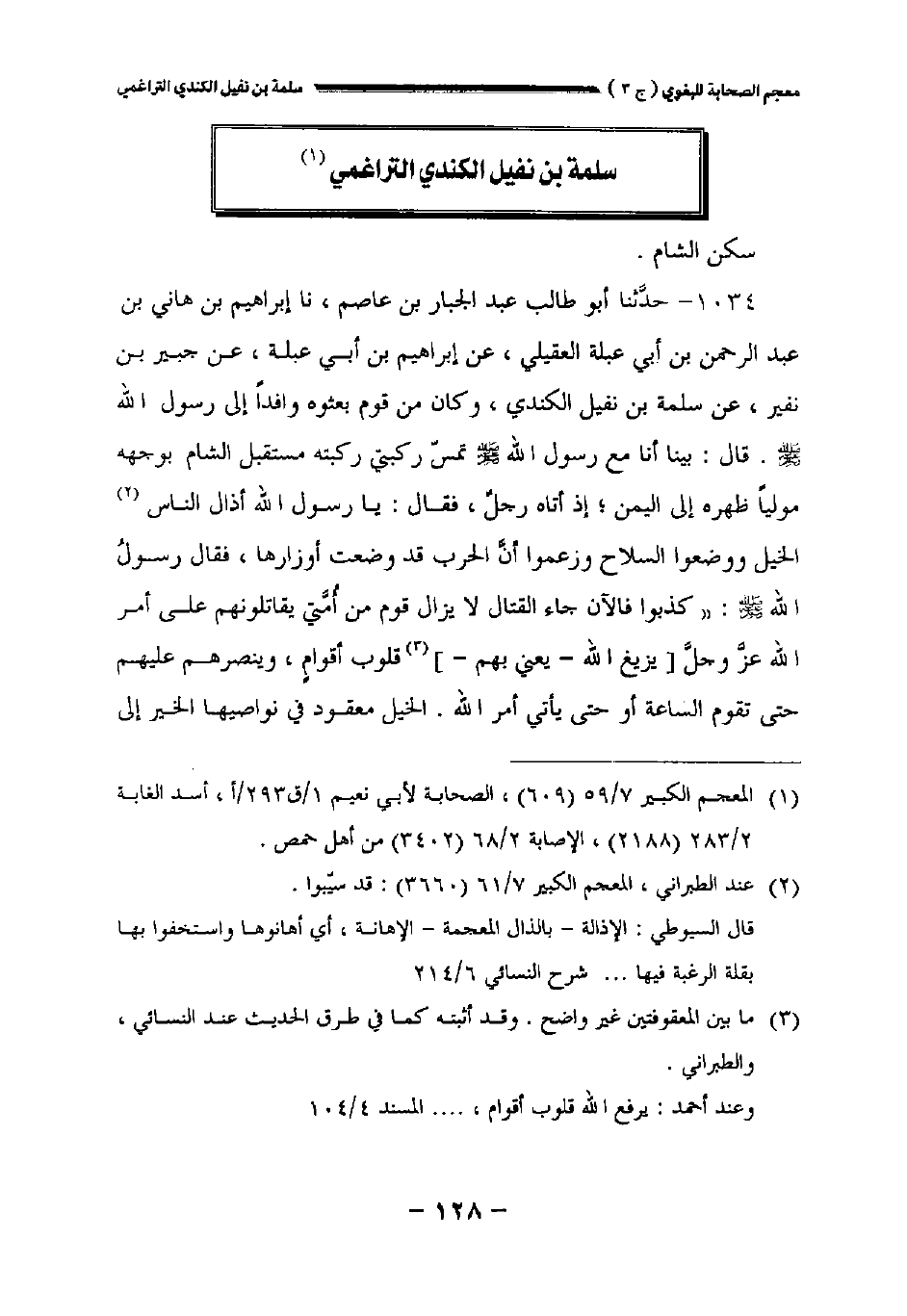 ١٠٣٤ - حدثنا أبو طالب عبد الجبار بن عاصم نا إبراهيم بن هاني بن عبد الرحمن بن أبي عبلة العقيلي عن إبراهيم بن أبي عبلة عن جبير بن نفير عن سلمة بن نفيل الكندي وكان من قوم بعثوه وافدا إلى رسول الله صلى الله عليه وسلم. قال: " بينا أنا مع رسول الله صلى الله عليه وسلم تمس ركبتي ركبته مستقبل الشام بوجهه موليا ظهره إلى اليمن إذ أتاه رجل، فقال: يارسول الله أذال الناس الخيل ووضعوا السلاح وزعموا أن الحرب قد وضعت أوزارها فقال رسول الله صلى الله عليه وسلم: " كذبوا فالآن جاء القتال لا يزال قوم من أمتي يقاتلونهم على أمر الله عز وجل [يزيغ الله - يعني بهم -] قلوب أقوام وينصرهم عليهم حتى تقوم الساعة أو حتى يأتي أمر الله. الخيل معقود في نواصيها الخير إلى