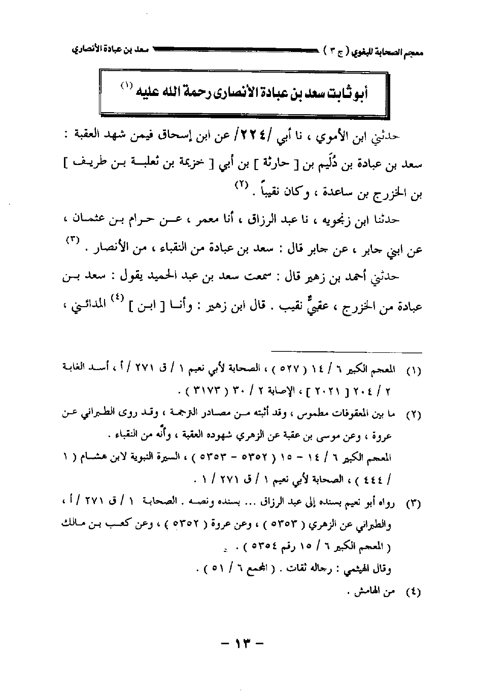 حدثنا ابن زنجويه نا عبد الرزاق أخبرنا معمر عن حرام بن عثمان عن ابني جابر عن جابر قال: سعد بن عبادة من النقباء من الأنصار.