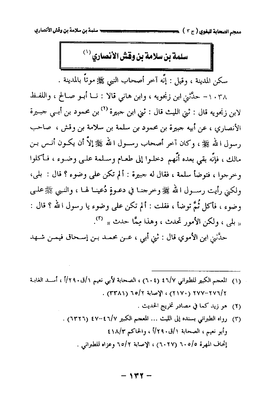 ١٠٣٨ - حدثني ابن زنجويه وابن هاني قالا: نا أبو صالح واللفظ لابن زنجويه قال: حدثني الليث قال: حدثني ابن جبيرة بن محمود بن أبي جبيرة الأنصاري عن أبيه جبيرة بن محمود بن سلمة بن سلامة بن وقش صاحب رسول الله صلى الله عليه وسلم وكان آخر أصحاب رسول الله صلى الله عليه وسلم إلا أن يكون أنس بن مالك فإنه بقي بعده أنهم دخلوا إلى طعام وسلمة على وضوء فأكلوا وخرجوا فتوضأ سلمة فقال له جبيرة: ألم تكن على وضوء؟ قال: بلى ولكني رأيت رسول الله صلى الله عليه وسلم وخرجنا في دعوة دعينا لها، والنبي صلى الله عليه وسلم على وضوء فأكل ثم توضأ فقلت: ألم تكن على وضوء يارسول الله؟ قال: " بلى ولكن الأمور تحدث وهذا مما حدث.