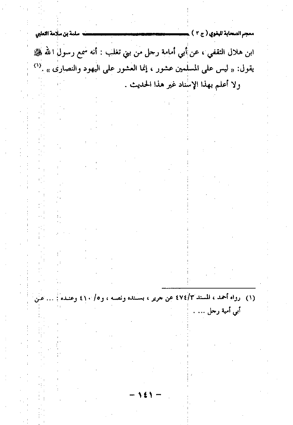 بن هلال الثقفي عن أبي أمامة رجل من بني تغلب: أنه سمع رسول الله صلى الله عليه وسلم يقول: " ليس على المسلمين عشور إنما العشور على اليهود والنصارى.
