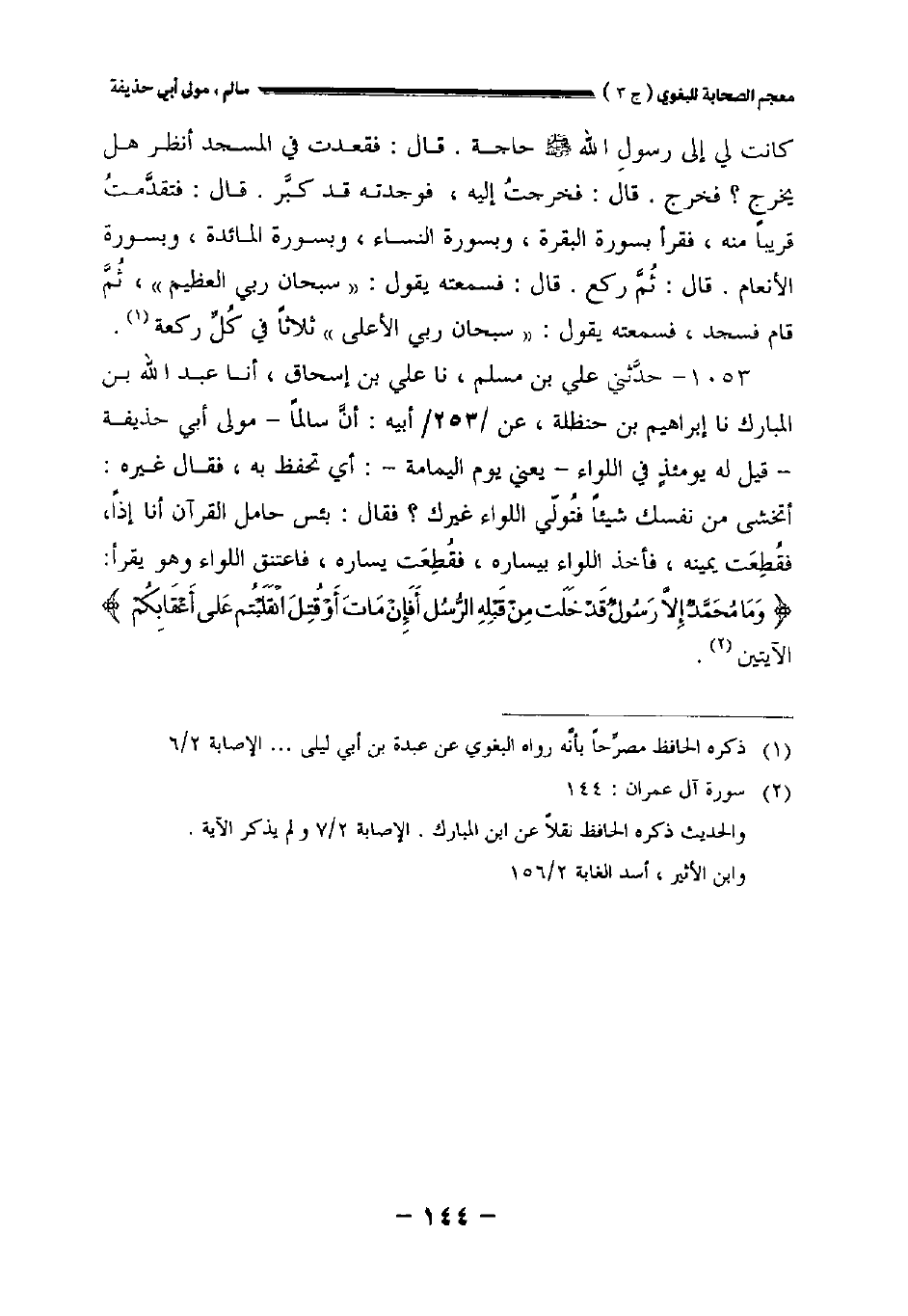 ١٠٥٣ - حدثني علي بن مسلم نا علي بن إسحاق أخبرنا عبد الله بن المبارك نا إبراهيم بن حنظلة عن//٢٥٣// أبيه: أن سالما مولى أبي حذيفة قيل له يومئذ في اللواء يعني يوم اليمامة: أي تحفظ به فقال غيره: أتخشى من نفسك شيئا فتولى اللواء غيرك؟ فقال: بئس حامل القرآن أنا إذا فقطعت يمينه فأخذ اللواء بيساره فقطعت يساره فاعتنق اللواء وهو يقرأ: {وما محمد إلا رسول قد خلت من قبله الرسل أفإن مات أو قتل انقلبتم على أعقابكم} الآيتين.