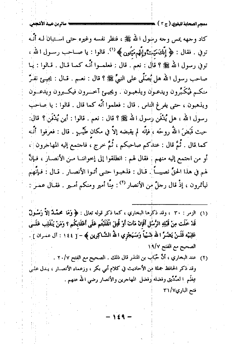 كاد وجهه يمس وجه رسول الله صلى الله عليه وسلم فنظر نفسه وغيره حتى استبان له أنه توفي. فقال {إنك ميت وإنهم ميتون}. قالوا: يا صاحب رسول الله صلى الله عليه وسلم توفي رسول الله صلى الله عليه وسلم؟ قال: نعم. قال: فعلموا أنه كما قال. قالوا: يا صاحب رسول الله صلى الله عليه وسلم هل يصلى على النبي صلى الله عليه وسلم؟ قال: نعم. قال: يجيء نفر منكم فيكبرون ويدعون ويذهبون. ويجيىء آخرون فيكبرون ويدعون ويذهبون حتى يفرغ الناس. قال: فعلموا أنه كما قال. قالوا: يا صاحب رسول الله هل يدفن رسول الله صلى الله عليه وسلم؟ قال: نعم. قالوا: أين يدفن؟ قال: حيث قبض الله روحه فإنه لم يقبضه إلا في مكان طيب. قال: فعرفوا أنه كما قال.