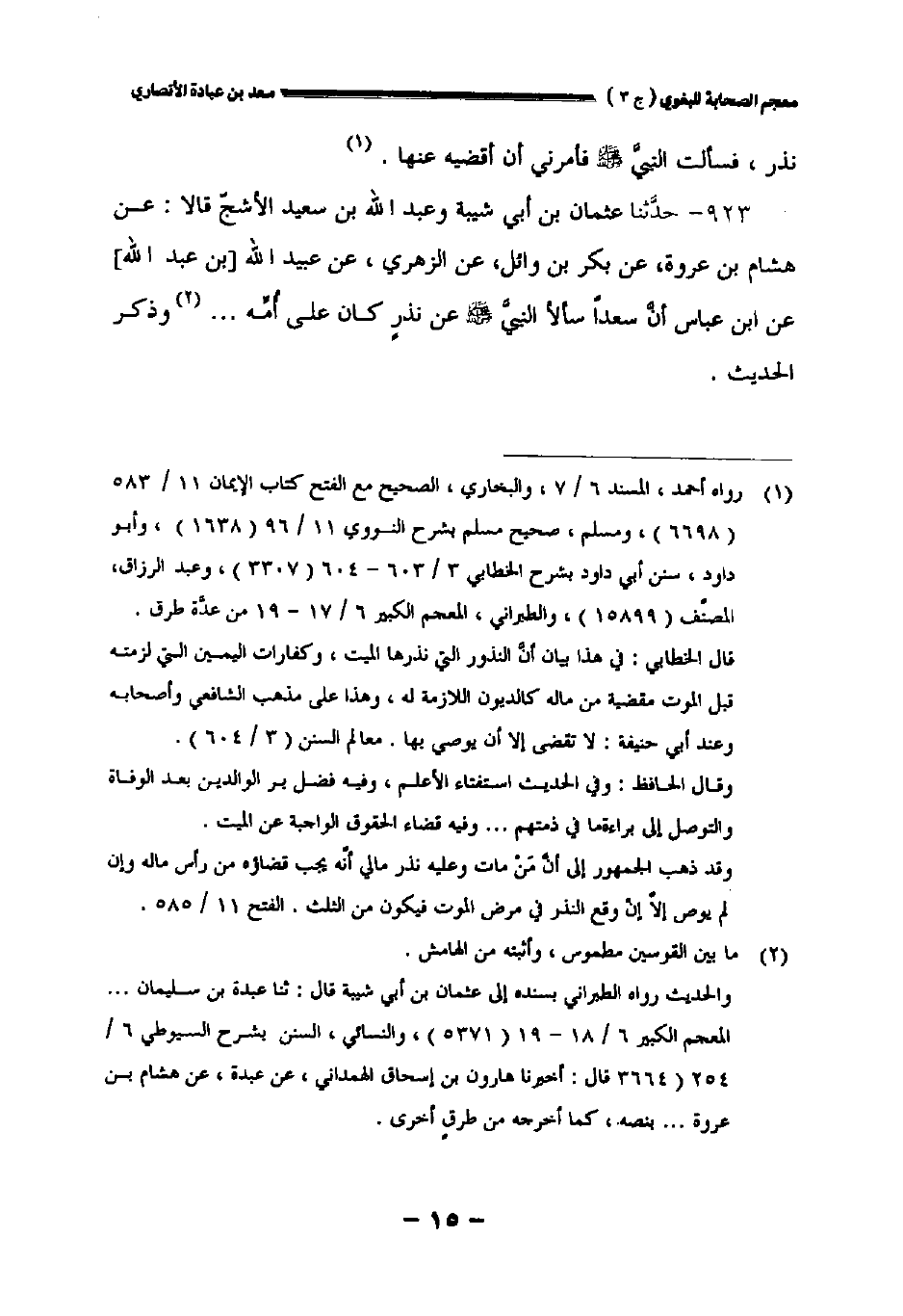 ٩٢٣ - حدثنا عثمان بن أبي شيبة وعبد الله بن سعيد الأشج قالا: عن هشام بن عروة عن بكر بن وائل عن الزهري عن عبيد الله [بن عبد الله] عن ابن عباس أن سعدا سأل النبي صلى الله عليه وسلم عن نذر كان على أمه .. وذكر الحديث.