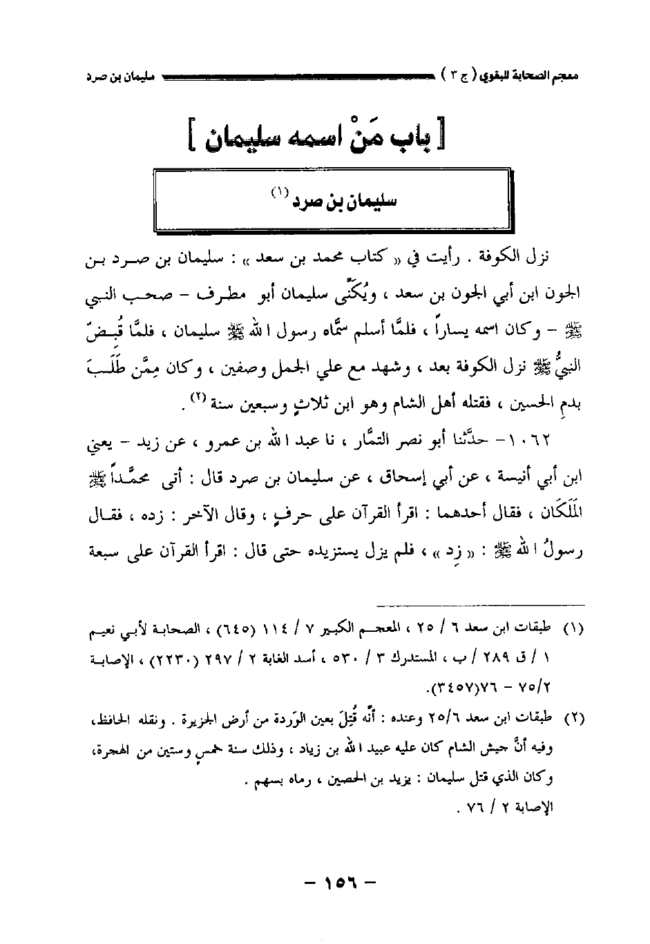 رأيت في " كتاب محمد بن سعد ": سليمان بن صرد بن الجون بن أبي الجون بن سعد ويكنى سليمان أبو مطرف صحب النبي صلى الله عليه وسلم وكان اسمه يسارا فلما أسلم سماه رسول الله صلى الله عليه وسلم سليمان فلما قبض النبي صلى الله عليه وسلم نزل الكوفة بعد وشهد مع علي الجمل وصفين وكان ممن طلب بدم الحسين فقتله أهل الشام وهو ابن ثلاث وسبعين سنة (**).