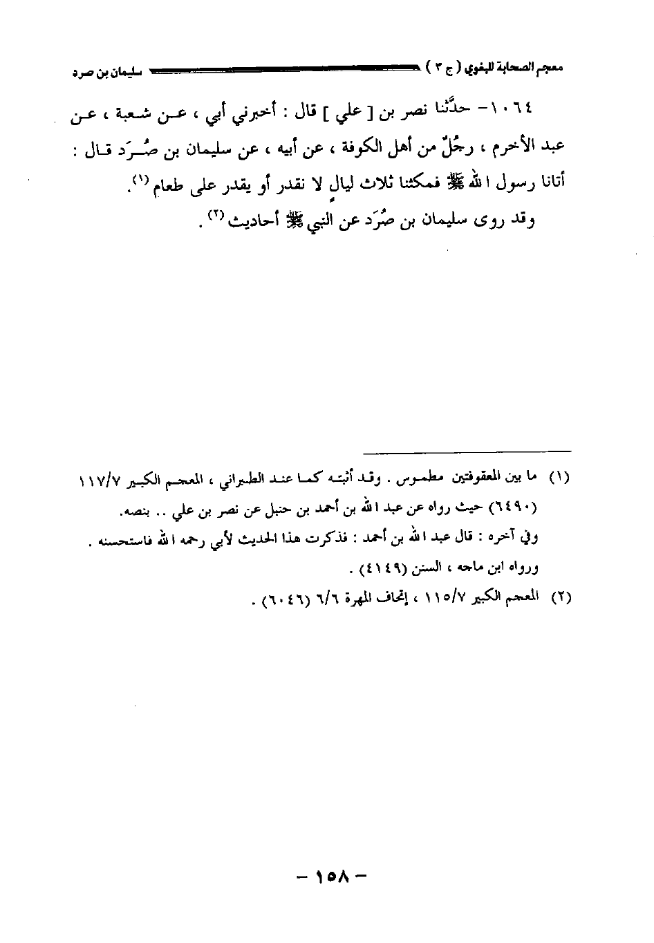 ١٠٦٤ - حدثنا نصر بن [علي] قال: أخبرني أبي عن شعبة عن عبد الأخرم رجل من أهل الكوفة عن أبيه عن سليمان بن صرد قال: أتانا رسول الله صلى الله عليه وسلم فمكثنا ثلاث ليال لا نقدر أو يقدر على طعام.