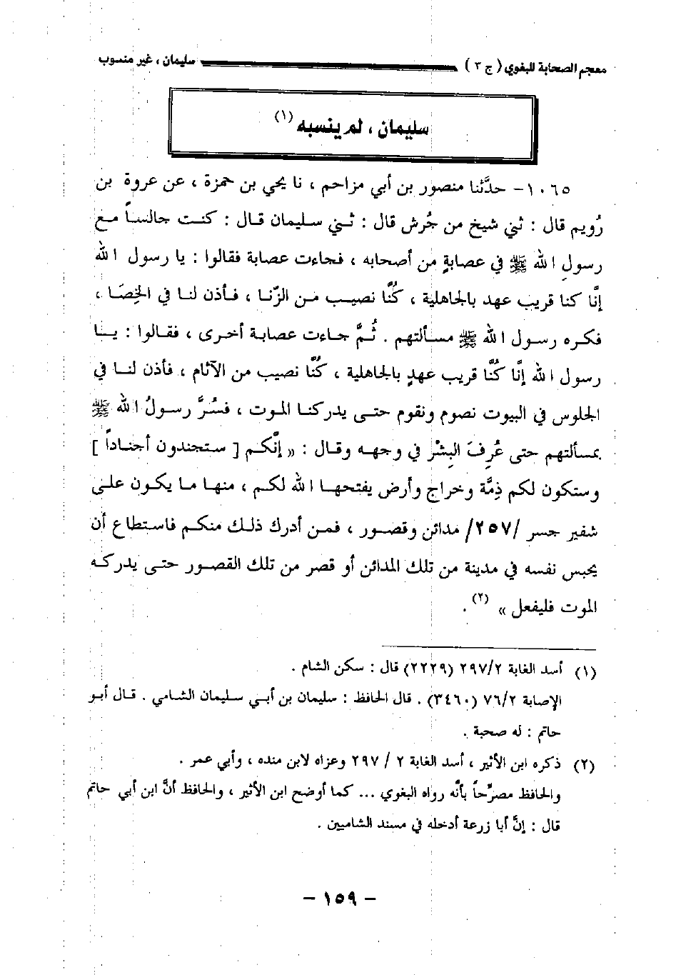 ١٠٦٥ - حدثنا منصور بن أبي مزاحم نا يحيى بن حمزة عن عروة بن رؤيم قال: حدثني شيخ من جرش قال: حدثني سليمان قال: كنت جالسا مع رسول الله صلى الله عليه وسلم في عصابة من أصحابه فجاءت عصابه فقالوا: يارسول الله إنا كنا قريب بالجاهلية كنا نصيب من الزنا فأذن لنا في الخصا فكره رسول الله صلى الله عليه وسلم مسألتهم. ثم جاءت عصابه أخرى فقالوا: يا رسول الله إنا كنا قريب عهد بالجاهلية كنا نصيب من الآثام فأذن لنا في - ل٧/ب - الجلوس في البيوت نصوم ونقوم حتى يدركنا الموت فسر رسول الله صلى الله عليه وسلم بمسألتهم حتى عرف البشر في وجهه وقال: " إنكم [ستجندون أجنادا] وستكون لكم ذمة وخراج وأرض يفتحها الله لكم منها ما يكون على شفير جسر//٢٥٧// مدائن وقصور فمن أدرك منكم فاستطاع أن يحبس نفسه في مدينة من تلك المدائن أو قصر من تلك القصور حتى يدركه الموت فليفعل.